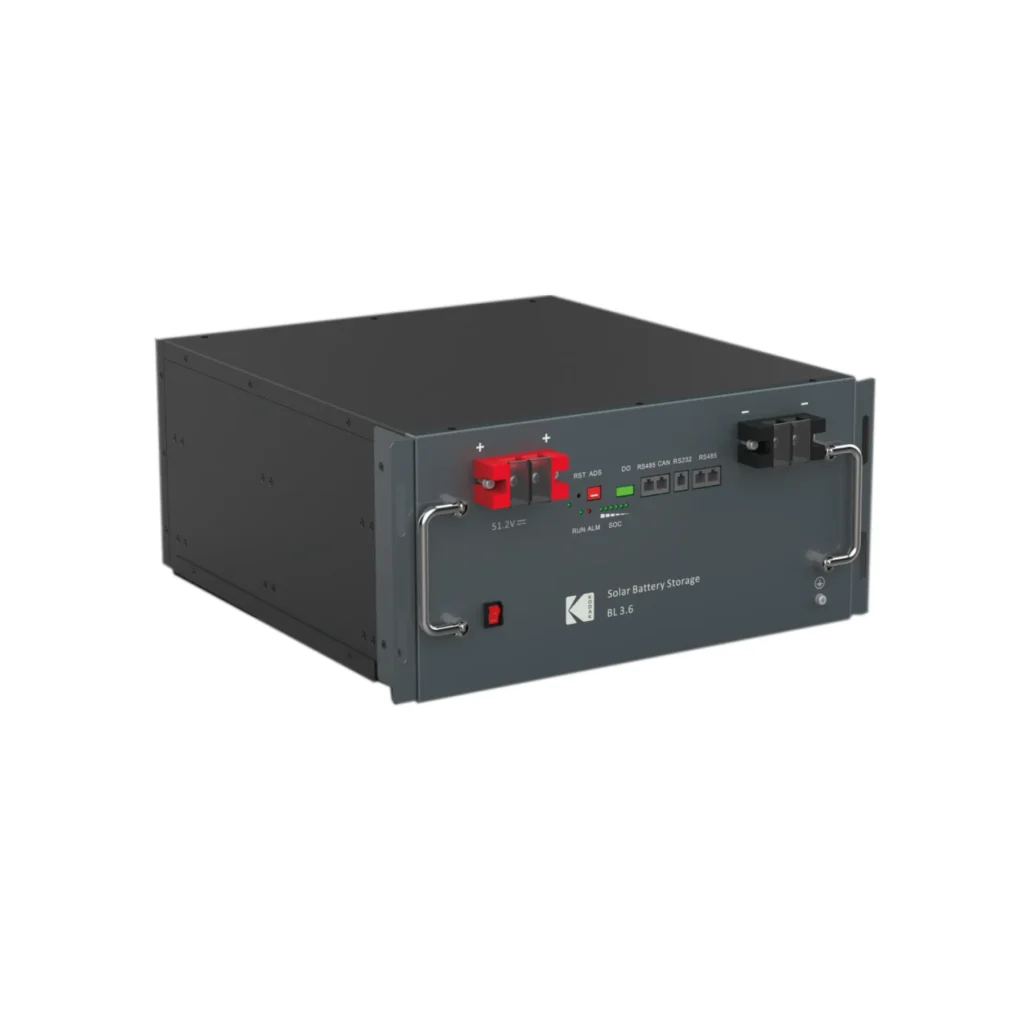 The BL3.6 Kodak battery is a high performance, 3.68kWh, scalable battery module perfect for expanding systems. A Single BL3.6 battery module allows up to 5000W of continuous discharge power. This means only one BL3.6 battery module is required for a 5kW inverter or only two required for a 10kW inverter.